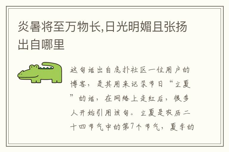 “炎暑将至万物长,日光明媚且张扬”这句话出自虎扑社区一位用户的博客,是其用来记录节日“立夏”的话,在网络上走红后,很多人开始引用该句。立夏是农历二十四节气中的第7个节气,夏季的第一个节气,表示盛夏时节的正式开始,太阳到达黄经45度时为立夏节气。斗指东南,维为立夏,万物至此皆长大,故名立夏也。