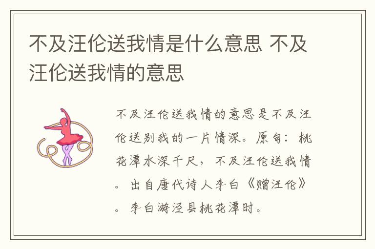 不及汪伦送我情是什么意思 不及汪伦送我情的意思 知识分享 23年2月15日 编辑 童画 取消关注 关注 私信 不及汪伦送我情的意思是不及汪伦送别我的一片情深。 原句:桃花潭水深千尺,不及汪伦送我情。出自唐代诗人李白《赠汪伦》。 李白游泾县桃花潭时,常在村民汪伦家作客。临走时,汪伦来送行,于是李白写这首留别。诗中表达了李白对汪伦这个普通村民的深情厚谊。这首诗用比兴手法,表达了对汪伦深情相送的感激。 No related posts. 本文内容由互联网用户自发贡献,该文观点仅代表作者本人。本站仅提供信息存储空间服务,不拥有所有权,不承担相关法律责任。如发现本站有涉嫌抄袭侵权/违法违规的内容, 请发送邮件至 2245678901@qq.com 举报,一经查实,本站将立刻删除。 给TA打赏 共{{data.count}}人 人已打赏