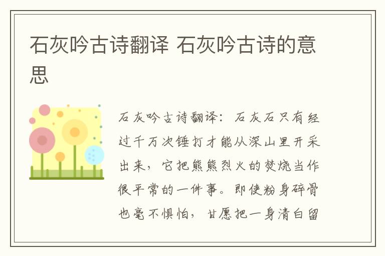 石灰吟古诗翻译:石灰石只有经过千万次锤打才能从深山里开采出来,它把熊熊烈火的焚烧当作很平常的一件事。即使粉身碎骨也毫不惧怕,甘愿把一身清白留在人世间。《石灰吟》是明代政治家、文学家于谦创作的一首七言绝句。此诗托物言志,采用象征手法,字面上是咏石灰,实际借物喻人,托物寄怀,表现了诗人高洁的理想。