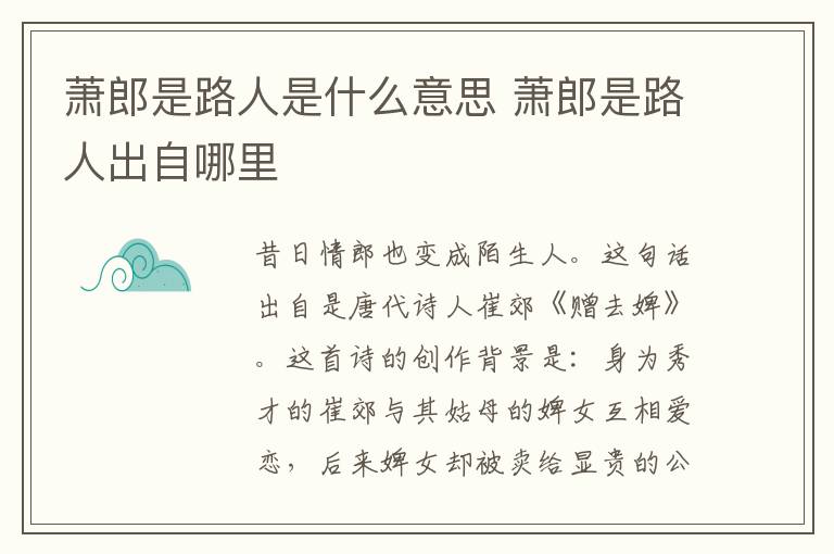 “萧郎是路人”的意思是:昔日情郎也变成陌生人。这句话出自是唐代诗人崔郊《赠去婢》。这首诗的创作背景是:身为秀才的崔郊与其姑母的婢女互相爱恋,后来婢女却被卖给显贵的公子哥,崔郊念念不忘,思慕无已。在一个寒食节,婢女偶尔外出与崔郊邂逅,崔郊百感交集,写下了这首《赠去婢》。