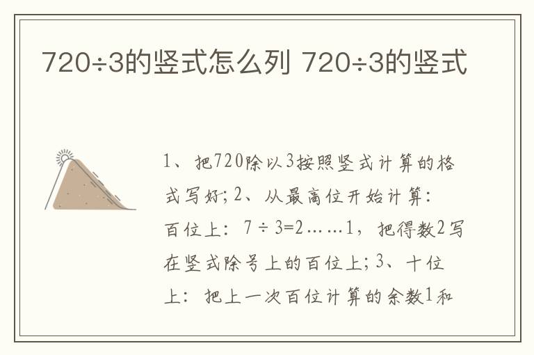 720÷3的竖式的写法:1、把720除以3按照竖式计算的格式写好;2、从最高位开始计算:百位上:7÷3=2……1,把得数2写在竖式除号上的百位上;3、十位上:把上一次百位计算的余数1和十位上的2合并计算,即12除以3,得数为4,把得数4写在竖式除号上的十位上;4、个位上:0÷3=0,个位上的得数是0,即720÷3=240。