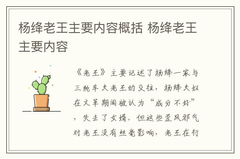 《老王》主要记述了杨绛一家与三轮车夫老王的交往,杨绛夫妇在文革期间被认为是“成分不好”,失去了女婿。但这些歪风邪气对老王都没有丝毫影响,老王才在行将就木之际,拿着自己舍不得吃的鸡蛋和香油来送给杨绛。作者回忆起老王,心中感受到了幸运者对一个不幸者的愧怍。