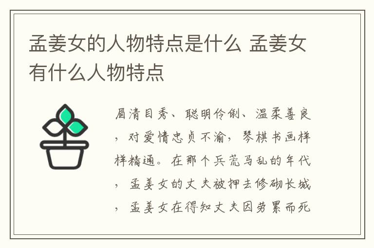 孟姜女是中国民间爱情故事中的一个人物形象,其人物特点是眉清目秀、聪明伶俐、温柔善良,对爱情忠贞不渝,琴棋书画样样精通。在那个兵荒马乱的年代,孟姜女的丈夫被押去修砌长城,孟姜女在得知丈夫因劳累而死后,在长城上哭得死去活来。秦始皇见到孟姜女后十分心动,但孟姜女对秦始皇恨之入骨,在安顿好了丈夫之后选择纵身跳海,因此成为了一段流传千年的佳话。