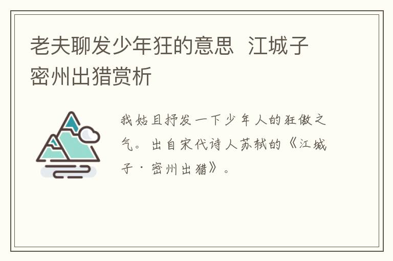 《江城子·密州出猎》是宋代文学家苏轼于密州知州任上所作的一首词,通过描写一次出猎的壮观场面,借历史典故抒发了作者杀敌为国的雄心壮志,体现了为了效力抗击侵略的豪情壮志,并委婉地表达了期盼得到朝廷重用的愿望。