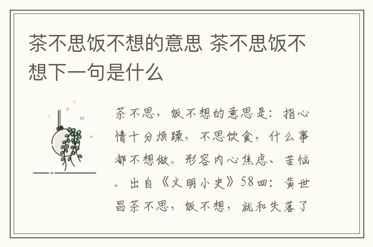 茶不思饭不想的意思 茶不思饭不想下一句是什么 知识分享 23年2月15日 编辑 童画 取消关注 关注 私信 茶不思,饭不想的意思是:指心情十分烦躁,不思饮食,什么事都不想做。形容内心焦虑、苦恼。指一个人丢了很重要的东西,连吃饭喝茶的时间都没有了。思考一件重要的事情,茶点和饭都吃不下。 出自《文明小史》58回:黄世昌茶不思,饭不想,就和失落了什么东西一样,一个人独坐在家里淌眼泪。 No related posts. 本文内容由互联网用户自发贡献,该文观点仅代表作者本人。本站仅提供信息存储空间服务,不拥有所有权,不承担相关法律责任。如发现本站有涉嫌抄袭侵权/违法违规的内容, 请发送邮件至 2245678901@qq.com 举报,一经查实,本站将立刻删除。 给TA打赏 共{{data.count}}人 人已打赏