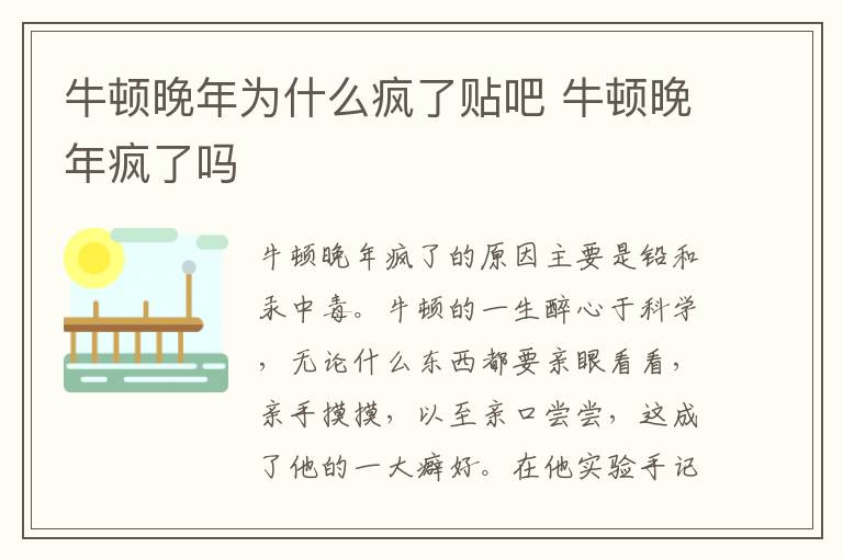 牛顿晚年疯了的原因主要是铅和汞中毒。牛顿的一生醉心于科学,无论什么东西都要亲眼看看,亲手摸摸,以至亲口尝尝,这成了他的一大癖好。在他实验手记里,有108处记载着他品尝各种物质的味道。