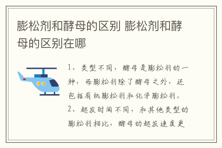 1、类型不同,酵母是膨松剂的一种,而膨松剂除了酵母之外,还包括有机膨松剂和化学膨松剂。2、起发时间不同,和其他类型的膨松剂相比,酵母的起发速度更慢,需要的时间更长。3、受环境影响程度不同,有机膨松剂和化学膨松剂受环境影响小,而酵母起发需要一定的温度和湿度。