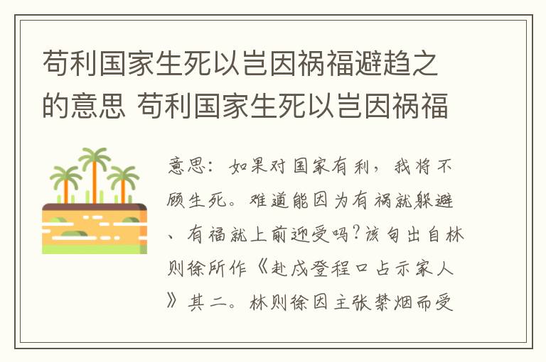 意思:如果对国家有利,我将不顾生死。难道能因为有祸就躲避、有福就上前迎受吗?该句出自林则徐所作《赴戍登程口占示家人》其二。林则徐因主张禁烟而受到谪贬伊犁充军的处分,被迫在西安与家人分别时为抒发自己的爱国情感以及性情人格而作,表达了作者愿为国献身,不计个人得失的崇高精神。诗作淳厚雍容、平和大度,颇合大臣之体。