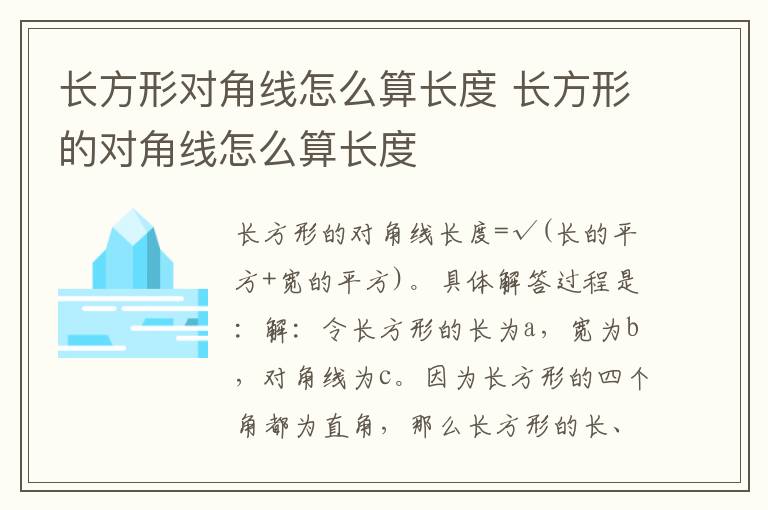 长方形的对角线长度=√(长的平方+宽的平方)。具体解答过程是:解:令长方形的长为a,宽为b,对角线为c。因为长方形的四个角都为直角,那么长方形的长、宽和对角线就构成一个直角三角形。那么根据三角形性质可得,a^2+b^2=c^2,可得c=√(a^2+b^2)。即长方形的对角线长度=√(长的平方+宽的平方)。