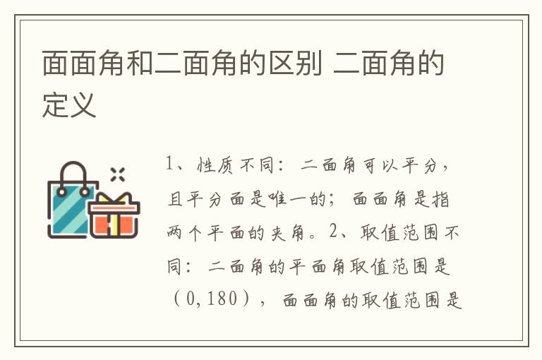 1、性质不同:二面角可以平分,且平分面是唯一的;面面角是指两个平面的夹角。2、取值范围不同:二面角的平面角取值范围是(0,180),面面角的取值范围是(0,90)。其中二面角的平面角的大小,与其顶点在棱上的位置无关。