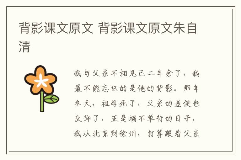 我与父亲不相见已二年余了,我最不能忘记的是他的背影。那年冬天,祖母死了,父亲的差使也交卸了,正是祸不单行的日子,我从北京到徐州,打算跟着父亲奔丧回家。到徐州见着父亲,看见满院狼藉的东西,又想起祖母,不禁簌簌地流下眼泪。父亲说,“事已如此,不必难过,好在天无绝人之路!”