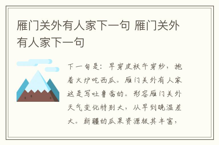 雁门关外有人家下一句 雁门关外有人家下一句 知识分享 23年2月15日 编辑 童画 取消关注 关注 私信 下一句是:早穿皮袄午穿纱,抱着火炉吃西瓜。雁门关外有人家这是写吐鲁番的。形容雁门关外天气变化特别大,从早到晚温差大。新疆的瓜果资源极其丰富,丰富的瓜果资源,不仅夏季吃瓜果是常事,而且到了数九寒天吃西瓜也不觉稀罕。 No related posts. 本文内容由互联网用户自发贡献,该文观点仅代表作者本人。本站仅提供信息存储空间服务,不拥有所有权,不承担相关法律责任。如发现本站有涉嫌抄袭侵权/违法违规的内容, 请发送邮件至 2245678901@qq.com 举报,一经查实,本站将立刻删除。 给TA打赏 共{{data.count}}人 人已打赏