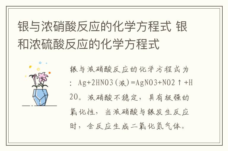 银与浓硝酸反应的化学方程式如下:Ag+2HNO3(浓)=AgNO3+NO2↑+H2O。浓硝酸不稳定,具有极强的氧化性,当浓硝酸与银发生反应时,会反应生成二氧化氮气体。浓硝酸容易挥发,对人体皮肤具有强烈刺激和腐蚀作用。