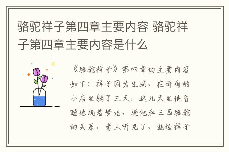 《骆驼祥子》第四章的主要内容如下:祥子因为生病,在海甸的小店里躺了三天,这几天里他昏睡地说着梦话,说他和三匹骆驼的关系,旁人听见了,就给祥子起了“骆驼祥子”的绰号。
