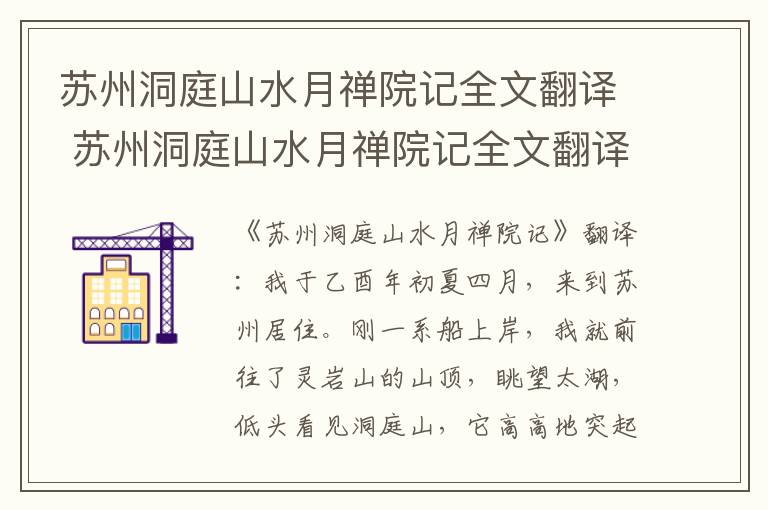 《苏州洞庭山水月禅院记》翻译:我于乙酉年初夏四月,来到苏州居住。刚一系船上岸,我就前往了灵岩山的山顶,眺望太湖,低头看见洞庭山,它高高地突起耸立,在云霞映衬下显得分外绚丽青翠,浮动在太湖的青青水波之中。当时,我依靠着栏杆仰起头,心神不定恍然有失,想要驾着清风,飞越西沉的太阳,在天空中翱翔,但却又不可能做到。