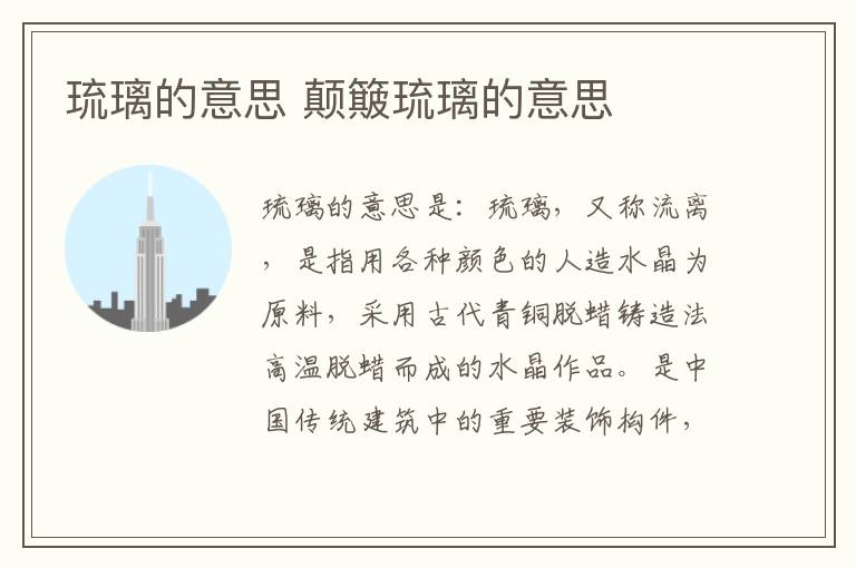 琉璃的意思是:琉璃,又称流离,是指用各种颜色的人造水晶为原料,采用古代青铜脱蜡铸造法高温脱蜡而成的水晶作品。是中国传统建筑中的重要装饰构件,通常用于宫殿、庙宇、陵寝等重要建筑,也是艺术装饰的一种带色陶器。