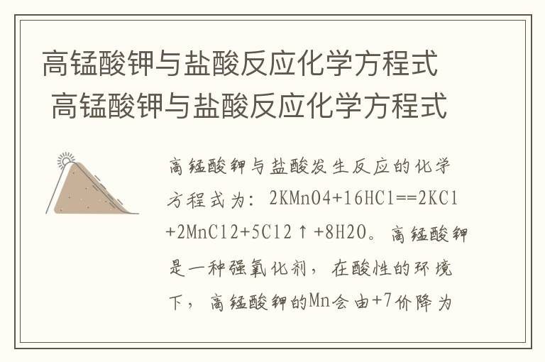 高锰酸钾与盐酸发生反应的化学方程式为:2KMnO4+16HCl==2KCl+2MnCl2+5Cl2↑+8H2O。高锰酸钾是一种强氧化剂,在酸性的环境下,高锰酸钾的Mn会由+7价降为+2价,因此会反应生成MnCl2和Cl2,最后再用电子守恒配平。