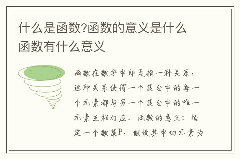 函数在数学中即是指一种关系,这种关系使得一个集合中的每一个元素都与另一个集合中的唯一元素互相对应。函数的意义:给定一个数集P,假设其中的元素为x。现对P中的元素x施加对应法则f,记为f(x);得另一数集Q。假设Q中的元素为y,那么y与x之间的等量关系必然能用y=f(x)表示。