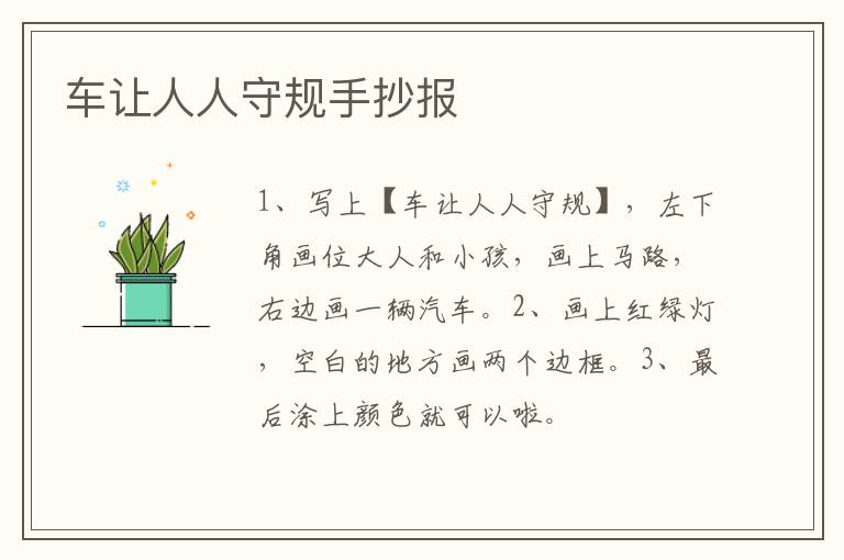 车让人人守规手抄报 知识分享 23年2月15日 编辑 童画 取消关注 关注 私信 1、写上【车让人人守规】,左下角画位大人和小孩,画上马路,右边画一辆汽车。 2、画上红绿灯,空白的地方画两个边框。 3、最后涂上颜色就可以啦。 No related posts. 本文内容由互联网用户自发贡献,该文观点仅代表作者本人。本站仅提供信息存储空间服务,不拥有所有权,不承担相关法律责任。如发现本站有涉嫌抄袭侵权/违法违规的内容, 请发送邮件至 2245678901@qq.com 举报,一经查实,本站将立刻删除。 给TA打赏 共{{data.count}}人 人已打赏