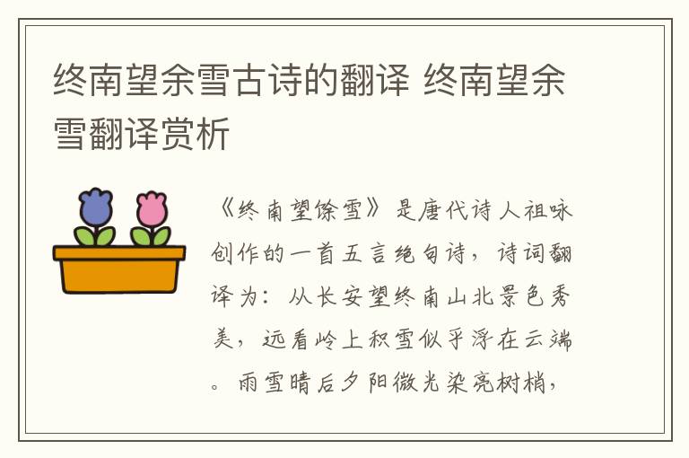 《终南望馀雪》是唐代诗人祖咏创作的一首五言绝句诗,诗词翻译为:从长安望终南山北景色秀美,远看岭上积雪似乎浮在云端。雨雪晴后夕阳微光染亮树梢,长安城中傍晚反增阵阵轻寒。《终南望馀雪》注释:终南:终南山,在唐京城长安南面六十里处。馀雪:指未融化之雪。馀,即余。阴岭:北面的山岭,背向太阳,故曰阴。林表:林外,林梢。霁:雨、雪后天气转晴。暮寒:傍晚的寒气。