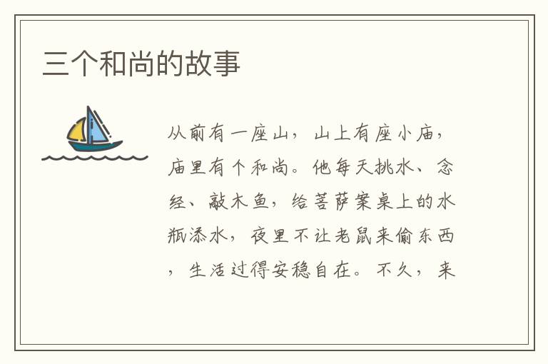 从前有一座山,山上有座小庙,庙里有个和尚。他每天挑水、念经、敲木鱼,给菩萨案桌上的水瓶添水,夜里不让老鼠来偷东西,生活过得安稳自在。