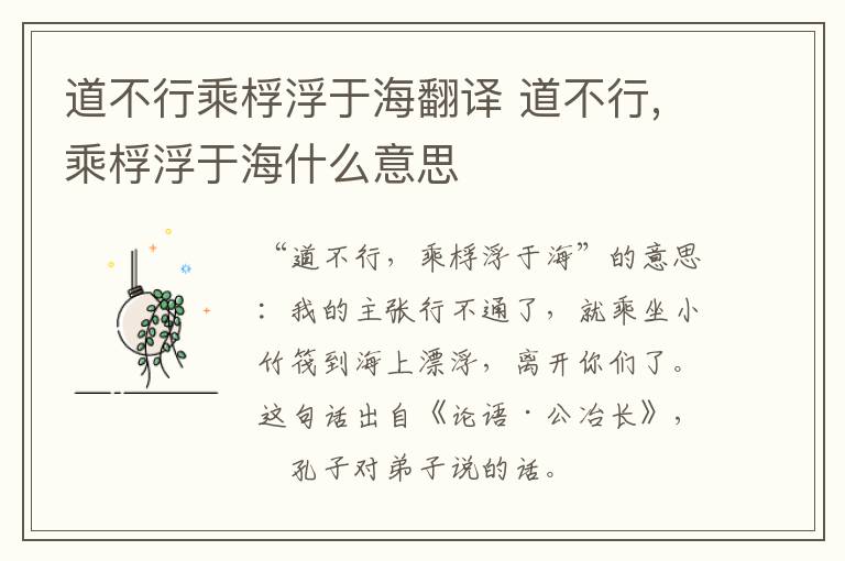 “道不行,乘桴浮于海”的意思:我的主张行不通了,就乘坐小竹筏到海上漂浮,离开你们了。这句话出自《论语·公冶长》,是孔子对弟子说的话。