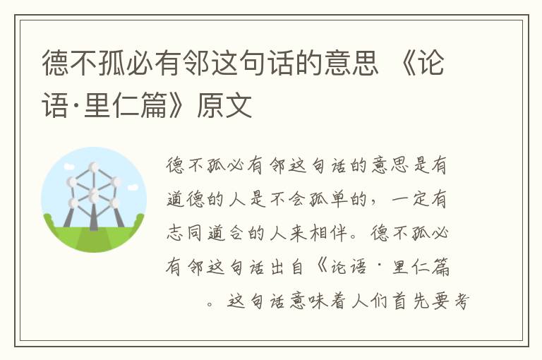 德不孤必有邻这句话的意思是有道德的人是不会孤单的,一定有志同道合的人来相伴。德不孤必有邻这句话出自《论语·里仁篇》。这句话意味着人们首先要考虑的问题,是自己是否努力,而不是旁边的人刚开始的时候会以什么样的眼光来看待人们。只要真是道德君子,那么即便在短时间内或许没有互相呼应的伙伴,但是时间长了就总会有同样性情和抱负的人过来与之亲近。