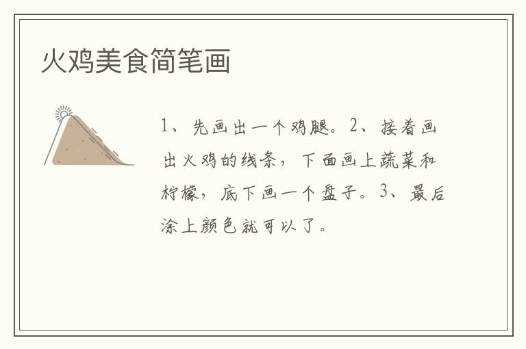 火鸡美食简笔画 知识分享 23年2月16日 编辑 童画 取消关注 关注 私信 1、先画出一个鸡腿。 2、接着画出火鸡的线条,下面画上蔬菜和柠檬,底下画一个盘子。 3、最后涂上颜色就可以了。 No related posts. 本文内容由互联网用户自发贡献,该文观点仅代表作者本人。本站仅提供信息存储空间服务,不拥有所有权,不承担相关法律责任。如发现本站有涉嫌抄袭侵权/违法违规的内容, 请发送邮件至 2245678901@qq.com 举报,一经查实,本站将立刻删除。 给TA打赏 共{{data.count}}人 人已打赏