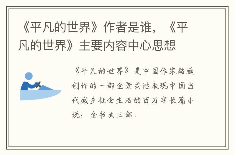 《平凡的世界》是中国作家路遥创作的一部全景式地表现中国当代城乡社会生活的百万字长篇小说,全书共三部。该书以中国70年代中期到80年代中期十年间为背景,通过复杂的矛盾纠葛,以孙少安和孙少平两兄弟为中心,刻画了当时社会各阶层众多普通人的形象。
