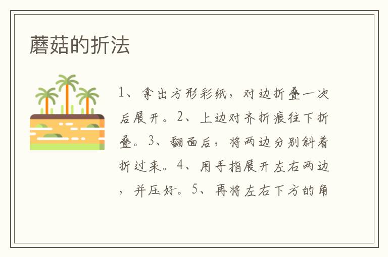 蘑菇的折法 知识分享 23年2月17日 编辑 童画 取消关注 关注 私信 1、拿出方形彩纸,对边折叠一次后展开。 2、上边对齐折痕往下折叠。 3、翻面后,将两边分别斜着折过来。 4、用手指展开左右两边,并压好。 5、再将左右下方的角向上斜着折好。 6、翻面,蘑菇就完成了。 No related posts. 本文内容由互联网用户自发贡献,该文观点仅代表作者本人。本站仅提供信息存储空间服务,不拥有所有权,不承担相关法律责任。如发现本站有涉嫌抄袭侵权/违法违规的内容, 请发送邮件至 2245678901@qq.com 举报,一经查实,本站将立刻删除。 给TA打赏 共{{data.count}}人 人已打赏