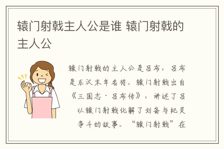 辕门射戟的主人公是吕布,吕布是东汉末年名将。辕门射戟出自《三国志·吕布传》,讲述了吕布以辕门射戟化解了刘备与纪灵的争斗的故事。“辕门射戟”在《三国演义》中被改编为“吕奉先射戟辕门”。