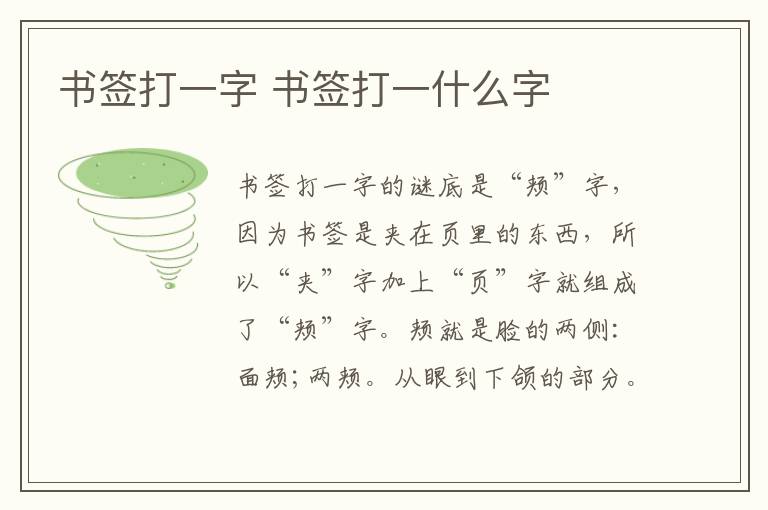 书签打一字的谜底是“颊”字,因为书签是夹在页里的东西,所以“夹”字加上“页”字就组成了“颊”字。颊就是脸的两侧:面颊;两颊。从眼到下颌的部分。