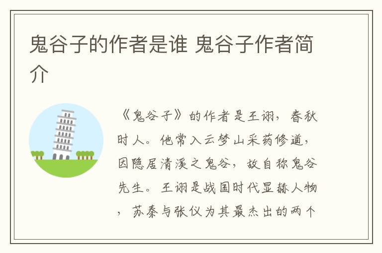 《鬼谷子》的作者是王诩,春秋时人。他常入云梦山采药修道,因隐居清溪之鬼谷,故自称鬼谷先生。王诩是战国时代显赫人物,苏秦与张仪为其最杰出的两个弟子。