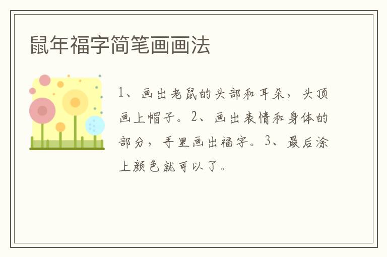 鼠年福字简笔画画法 知识分享 23年2月18日 编辑 童画 取消关注 关注 私信 1、画出老鼠的头部和耳朵,头顶画上帽子。 2、画出表情和身体的部分,手里画出福字。 3、最后涂上颜色就可以了。 No related posts. 本文内容由互联网用户自发贡献,该文观点仅代表作者本人。本站仅提供信息存储空间服务,不拥有所有权,不承担相关法律责任。如发现本站有涉嫌抄袭侵权/违法违规的内容, 请发送邮件至 2245678901@qq.com 举报,一经查实,本站将立刻删除。 给TA打赏 共{{data.count}}人 人已打赏