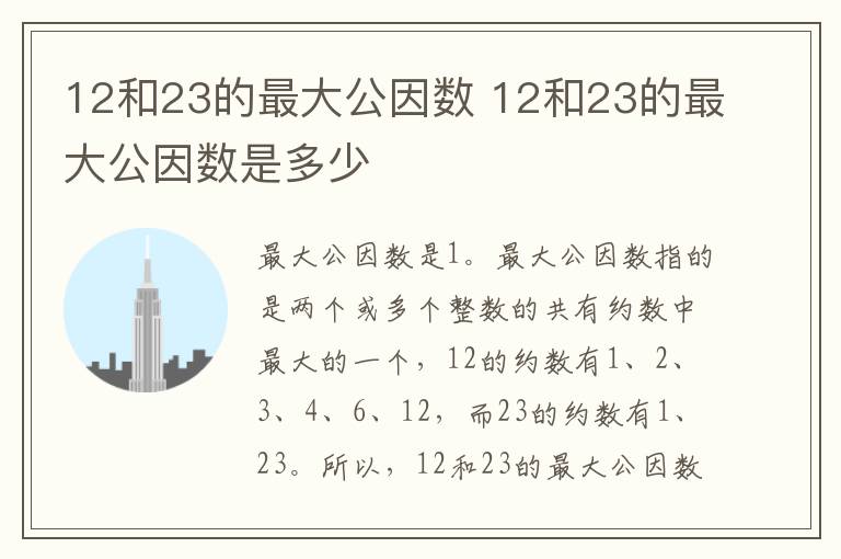 12和23的最大公因数 12和23的最大公因数是多少 知识分享 23年2月18日 编辑 童画 取消关注 关注 私信 12和23的最大公因数是1。最大公因数指的是两个或多个整数的共有约数中最大的一个,12的约数有1、2、3、4、6、12,而23的约数有1、23。所以,12和23的最大公因数是1。 最大公因数,也称最大公约数,指两个或多个整数共有约数中最大的一个,与最大公因数相对应的概念是最小公倍数。 No related posts. 本文内容由互联网用户自发贡献,该文观点仅代表作者本人。本站仅提供信息存储空间服务,不拥有所有权,不承担相关法律责任。如发现本站有涉嫌抄袭侵权/违法违规的内容, 请发送邮件至 2245678901@qq.com 举报,一经查实,本站将立刻删除。 给TA打赏 共{{data.count}}人 人已打赏