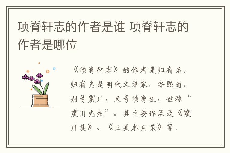 项脊轩志的作者是归有光。归有光是明代文学家,字熙甫,别号震川,又号项脊生,世称“震川先生”,其主要作品是《震川集》、《三吴水利录》等。