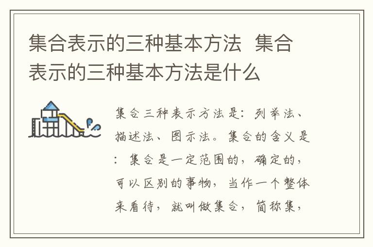 集合三种表示方法是:列举法、描述法、图示法。集合的含义是:集合是一定范围的,确定的,可以区别的事物,当作一个整体来看待,就叫做集合,简称集,其中各事物叫做集合的元素或简称元,是具有某种特定性质的事物的总体。