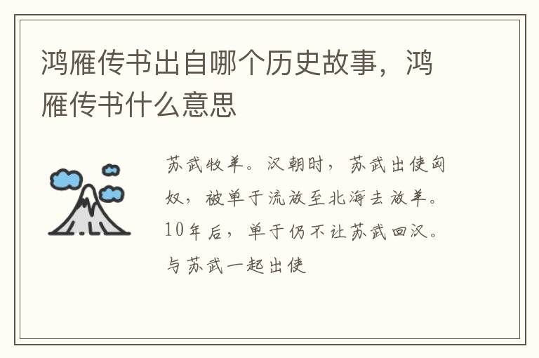 苏武牧羊。汉朝时,苏武出使匈奴,被单于流放至北海去放羊。10年后,单于仍不让苏武回汉。与苏武一起出使匈奴的常惠,把苏武的情况密告汉使,并设计让汉使对单于讲:汉朝皇帝打猎射得一雁,雁足上绑有书信,叙说了苏武在某个沼泽地带牧羊。单于听后,只有让苏武回汉。后来,人们就用鸿雁比喻书信和传递书信的人。