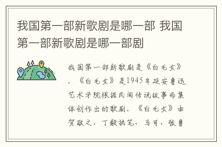我国第一部新歌剧是《白毛女》。《白毛女》是1945年延安鲁迅艺术学院根据民间传说故事而集体创作出的歌剧。《白毛女》由贺敬之、丁毅执笔,马可、张鲁、瞿维、焕之、向隅、陈紫、刘炽等作曲,是在新秧歌运动基础上发展起来的中国第一部新歌剧。
