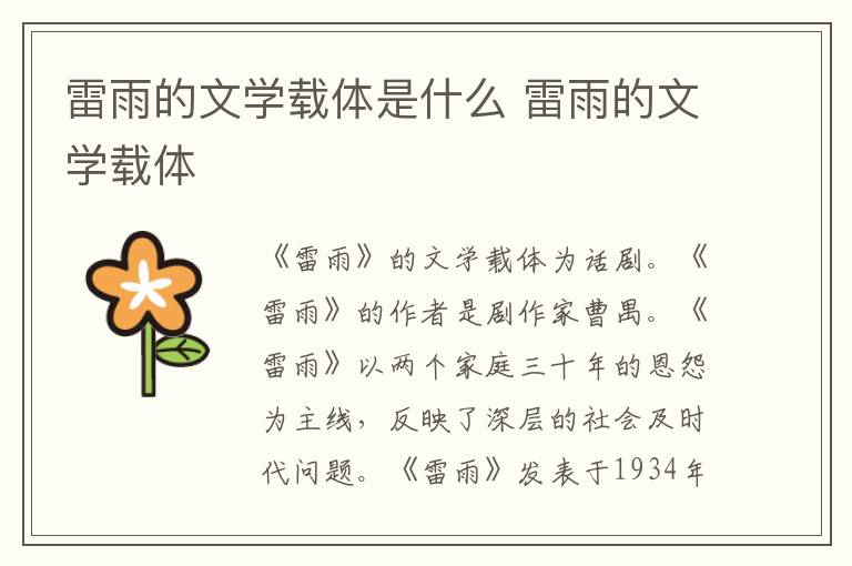 《雷雨》的文学载体为话剧。《雷雨》发表于1934年7月的《文学季刊》,描绘了1925年前后的中国社会现实,揭示了封建家庭的腐朽顽固与地主资产阶级的残酷与伪善。《雷雨》是被翻译成各国语言文字最多的中国话剧。
