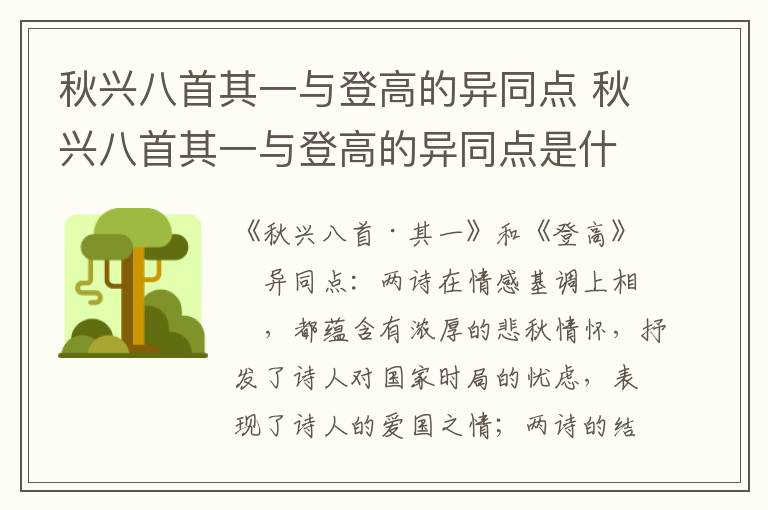 《秋兴八首·其一》和《登高》的异同点:两诗在情感基调上相同,都蕴含有浓厚的悲秋情怀,抒发了诗人对国家时局的忧虑,表现了诗人的爱国之情;两诗的结构处置也相同,都从描绘秋景图开始,营造出悲愁氛围之后,继而借景抒情;两诗在情感表达上有所区别,前者伤感氛围过浓,境界不如后者壮阔。