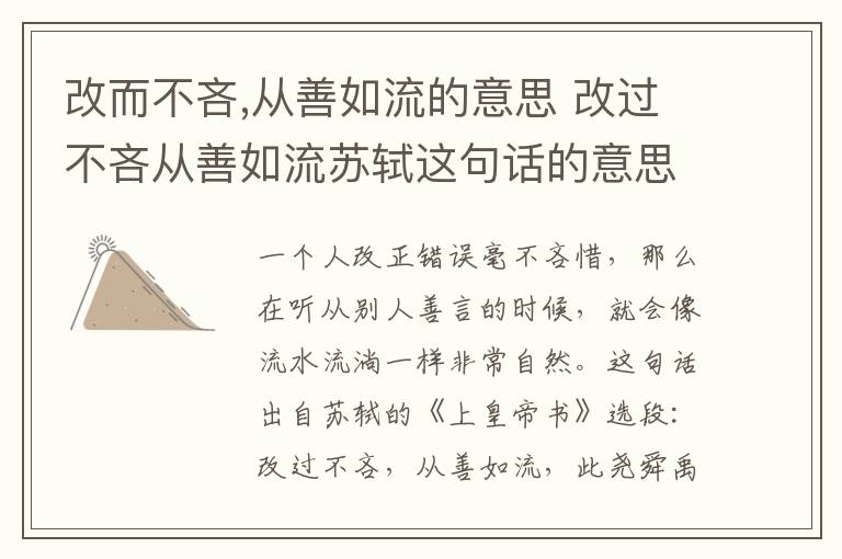 意思是一个人改正错误毫不吝惜,那么在听从别人善言的时候,就会像流水流淌一样非常自然。这句话出自苏轼的《上皇帝书》选段:改过不吝,从善如流,此尧舜禹汤之所勉强而力行,秦汉以来之所绝无而仅有。这句话所表达的意思,在现代也有非常积极的意义。