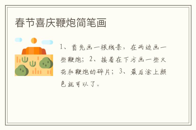 春节喜庆鞭炮简笔画 知识分享 23年2月18日 编辑 童画 取消关注 关注 私信 1、首先画一根线条,在两边画一些鞭炮; 2、接着在下方画一些火花和鞭炮的碎片; 3、最后涂上颜色就可以了。 No related posts. 本文内容由互联网用户自发贡献,该文观点仅代表作者本人。本站仅提供信息存储空间服务,不拥有所有权,不承担相关法律责任。如发现本站有涉嫌抄袭侵权/违法违规的内容, 请发送邮件至 2245678901@qq.com 举报,一经查实,本站将立刻删除。 给TA打赏 共{{data.count}}人 人已打赏