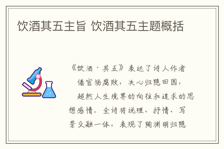 《饮酒·其五》表达了诗人作者厌倦官场腐败,决心归隐田园,对超然人生境界的向往和追求的思想感情。全诗将说理、抒情、写景交融一体,表现了陶渊明归隐田园后的人生态度和生活情趣。