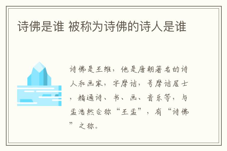 诗佛是王维,他是唐朝著名的诗人和画家,字摩诘,号摩诘居士,精通诗、书、画、音乐等,与孟浩然合称“王孟”,有“诗佛”之称。