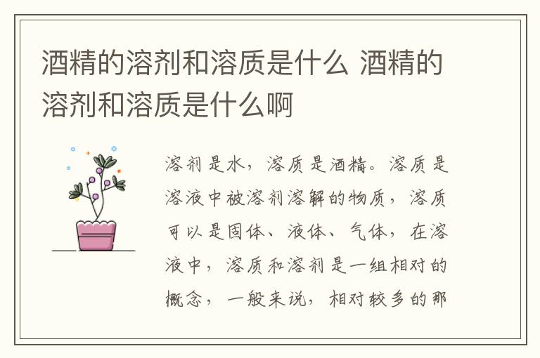 酒精的溶剂和溶质是什么 酒精的溶剂和溶质是什么啊 知识分享 23年2月18日 编辑 童画 取消关注 关注 私信 酒精的溶剂是水,溶质是酒精。溶质是溶液中被溶剂溶解的物质,溶质可以是固体、液体、气体,在溶液中,溶质和溶剂是一组相对的概念,一般来说,相对较多的那种物质称为溶剂,而相对较少的物质称为溶质,水默认为溶剂。 No related posts. 本文内容由互联网用户自发贡献,该文观点仅代表作者本人。本站仅提供信息存储空间服务,不拥有所有权,不承担相关法律责任。如发现本站有涉嫌抄袭侵权/违法违规的内容, 请发送邮件至 2245678901@qq.com 举报,一经查实,本站将立刻删除。 给TA打赏 共{{data.count}}人 人已打赏