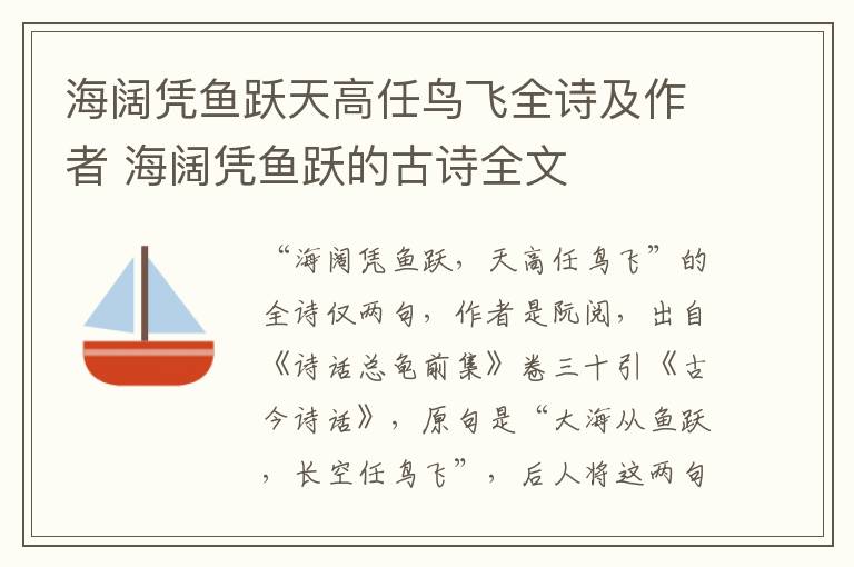 “海阔凭鱼跃,天高任鸟飞”的全诗仅两句,作者是阮阅,出自《诗话总龟前集》卷三十引《古今诗话》,原句是“大海从鱼跃,长空任鸟飞”,后人将这两句诗改写为现今版本。
