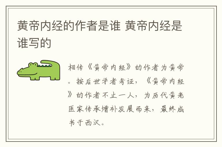 相传《黄帝内经》的作者为黄帝。按后世学者考证,《黄帝内经》的作者不止一人,为历代黄老医家传承增补发展而来,最终成书于西汉。