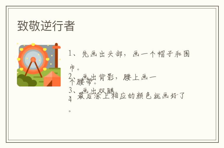 致敬逆行者 知识分享 23年2月18日 编辑 童画 取消关注 关注 私信 1、先画出头部,画一个帽子和围巾。 2、画出背影,腰上画一个腰带。 3、画出双腿。 4、最后涂上相应的颜色就画好了。 No related posts. 本文内容由互联网用户自发贡献,该文观点仅代表作者本人。本站仅提供信息存储空间服务,不拥有所有权,不承担相关法律责任。如发现本站有涉嫌抄袭侵权/违法违规的内容, 请发送邮件至 2245678901@qq.com 举报,一经查实,本站将立刻删除。 给TA打赏 共{{data.count}}人 人已打赏
