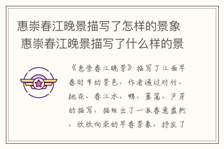 《惠崇春江晚景》描写了江面早春时节的景色,作者通过对竹、桃花、春江水、鸭、篓篙、芦芽的描写,描绘出了一派春意盎然,欣欣向荣的早春景象,抒发了作者对早春的喜悦和礼赞之情。